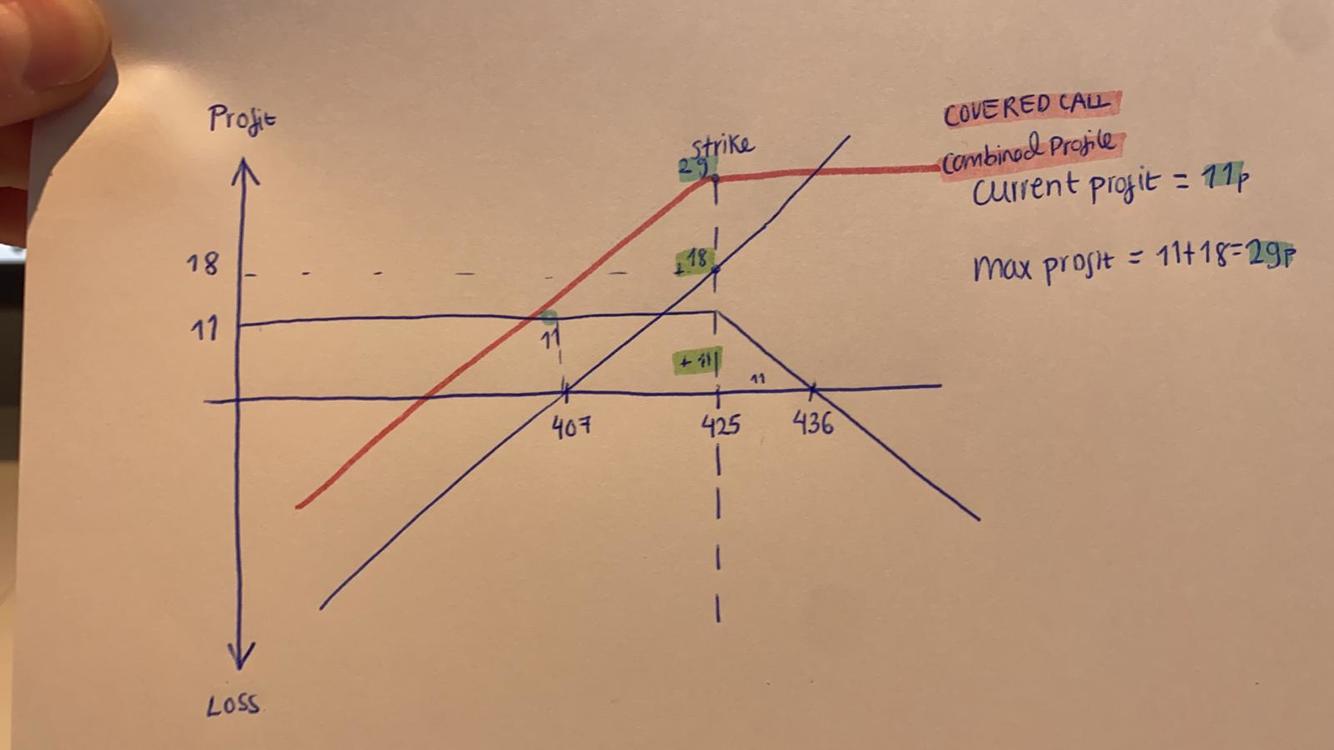 An investor is long a share at 407p and sells a 425 call for 11p.