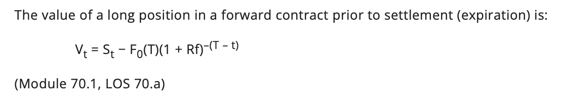 70.1 At time t, prior to its settlement date at time T, the value Vt of a long forward with a price of F will be related to the spot price, S, of an asset that has no holding costs or benefits by: