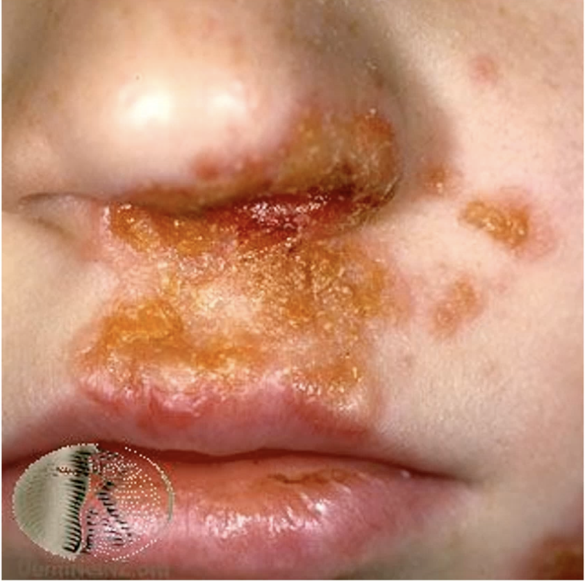 IMPETIGO = caused by staph aureus (a lot in the nose)