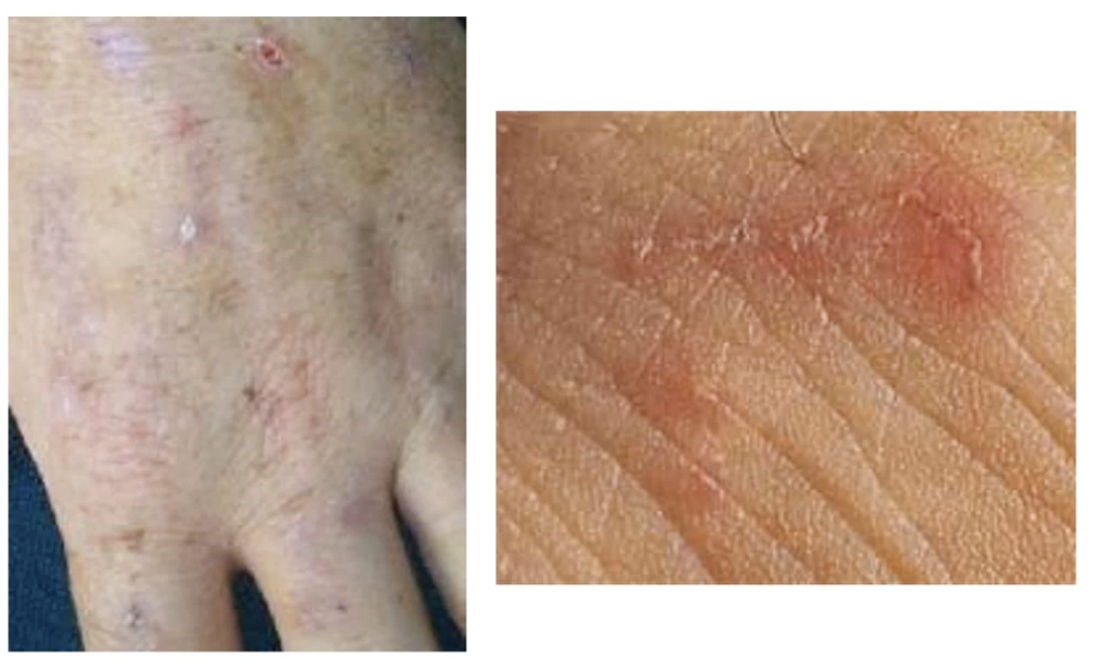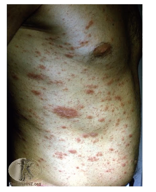 Scaly on arm, multiple red scaly eruptions