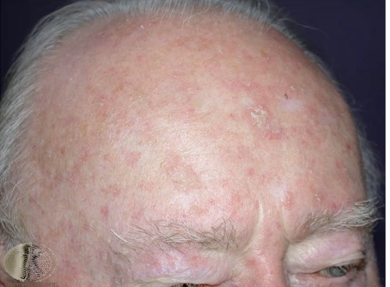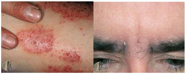 flaky eyebrows, red face, dandruff in scalp, red rash on arms and legs