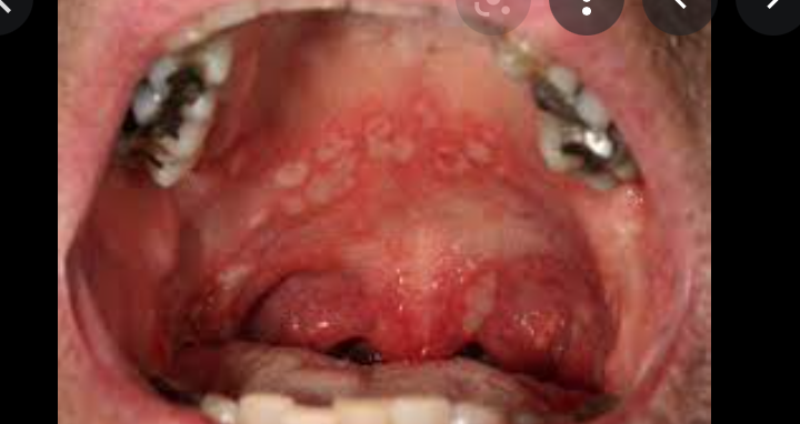 oral candidiasis= white, creamy, pseudomembranous plaques, common after oral antibiotics