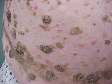 benign epidermal tumor of mid to elderly pts that presents with brown STUCK ON round lesions