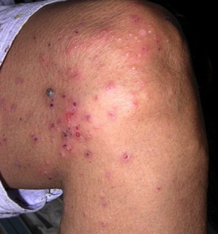 Itchy small red vesicular lesions on extensor surfaces (ie, elbow, knee, butt, torso)