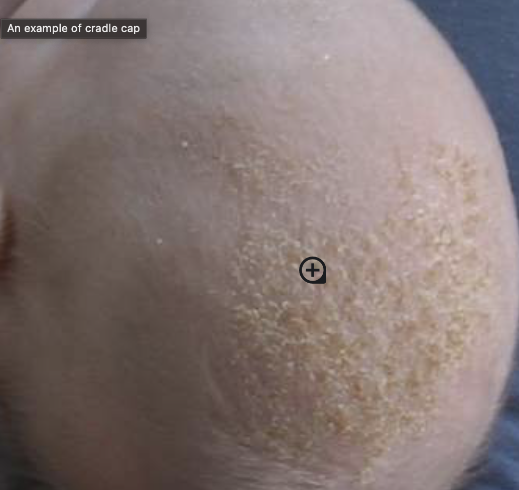 This patient has infantile seborrheoic dermatitis without signs of any inflammation of the scalp. A combination of emollients and clotrimazole 1% cream is the first line. Seborrheic dermatitis is usually caused by an overgrowth of the yeast Malassezia which is why antifungals can be effective.