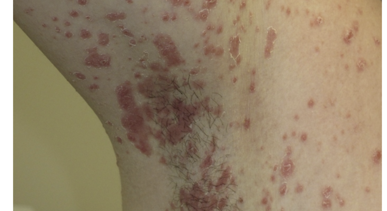 Rash occurs in Children and Young Adults. Pt present with Erythematous Papules and Plaques with a Fine Scale 2-3 weeks (ACUTE) after strep infection.