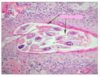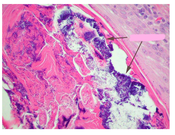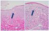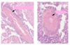 Folliculitis with staph (black arrows) and deep pyoderma; this is a hair follicle that is inflamed and contains numerous staphylococci