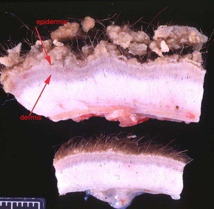 Laminated crusts and hyperkeratosis; AKA rain rot