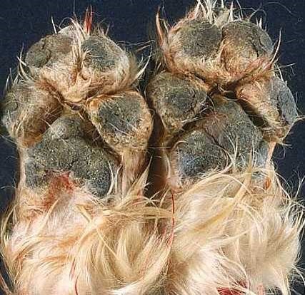 Hyperkeratosis of the foot pads caused by distemper virus - AKA hard pad disease