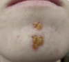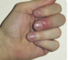 One isolated lesion and associated Hutchinson Sign (small macule surrounding on finger)