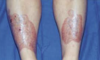 Painful wheals on the upper legs and back that have been present for 2 weeks. Individual lesions resolve with bruising in 3 to 4 days. The patient also reports some associated joint pain, particularly of the small joints in her hands.
