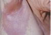 Mildly pruritic, thin erythematous-to-brown plaques with thin scale and an overlying wrinkled appearance and maceration in intertriginous areas such as the axillae, groin, and inframammary areas