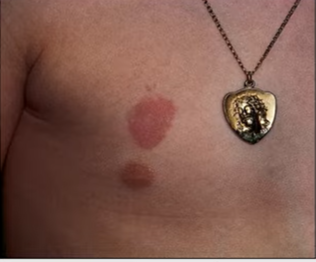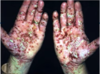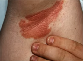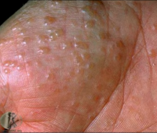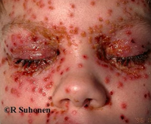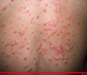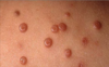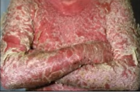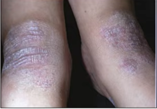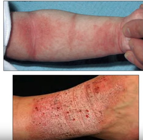 Chronic: Lichenifications, thickening of the skin, excoriations