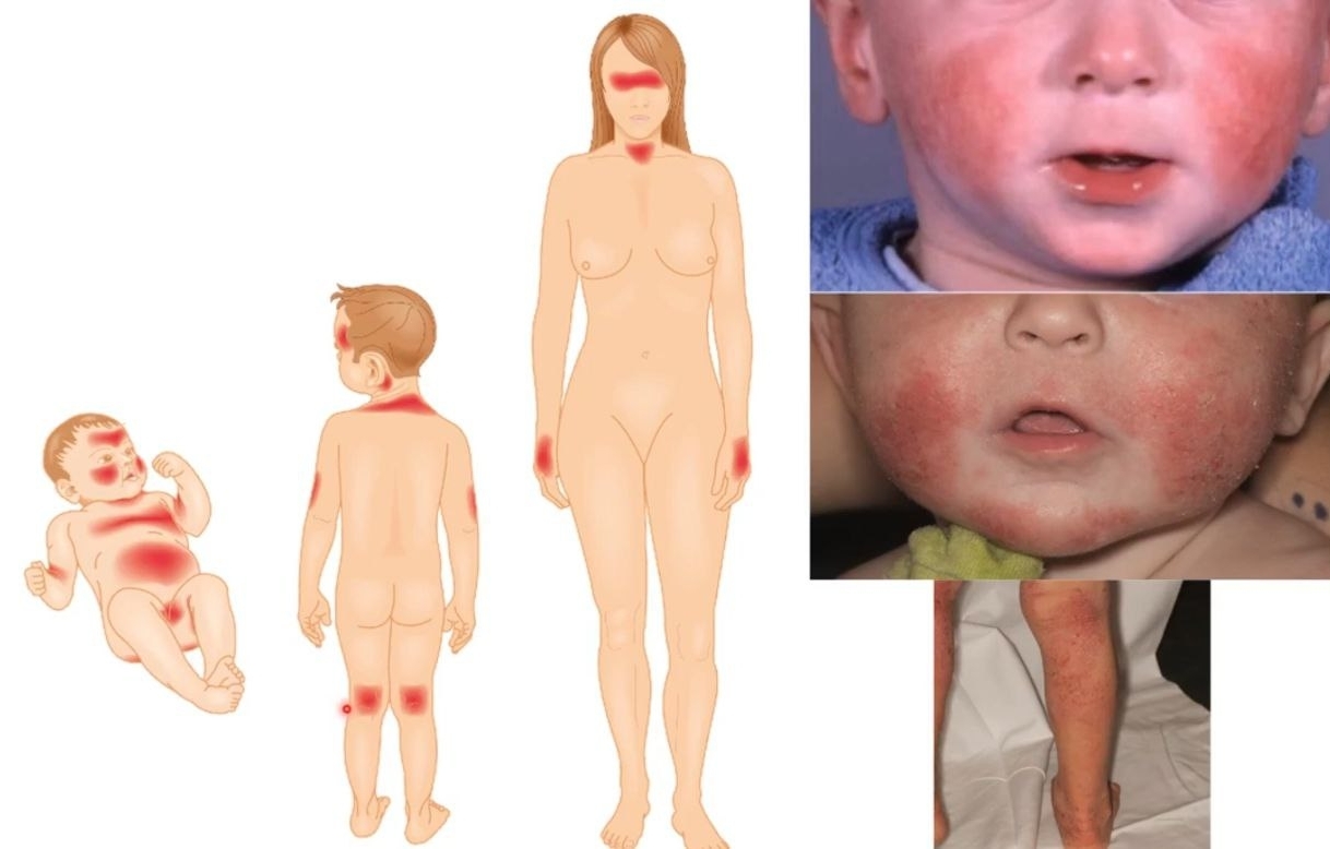 • lactancia: en cara ( respetando el triángulo nasogeniano) y superficies extensoras: eritema, papilas, costras hematicas