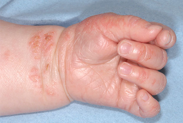 in childhood, initially with facial (cheeks) and subsequently flexural limb involvement