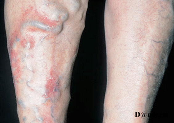 Increased hydrostatic pressure, oedema, red cell extravasation leading to irritation of the skin