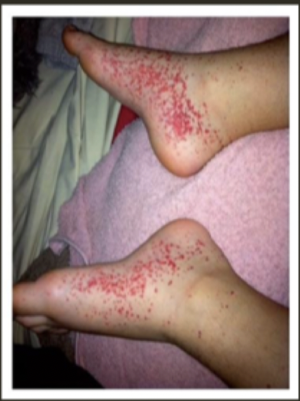 * Macules de la grosseur d’une tête d’aiguille causée par un infiltration de sang dans tissu dermique ;