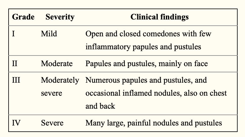 Initially open comedones (blackheads) or closed comedones (whiteheads) progressing to papules, pustules, nodules and cysts