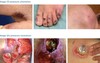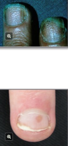 Can see nail pitting, onycholysis, subungual hyperkeratosis, and oil drop sign