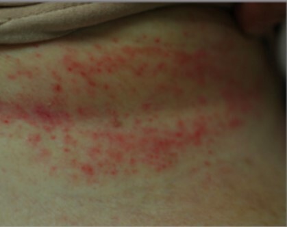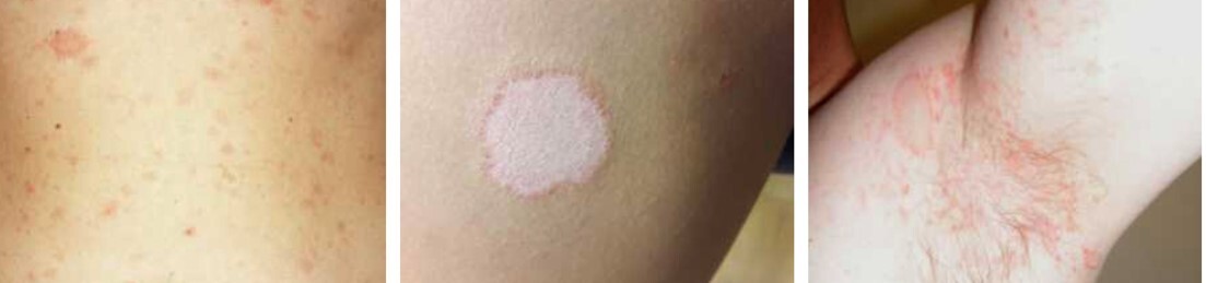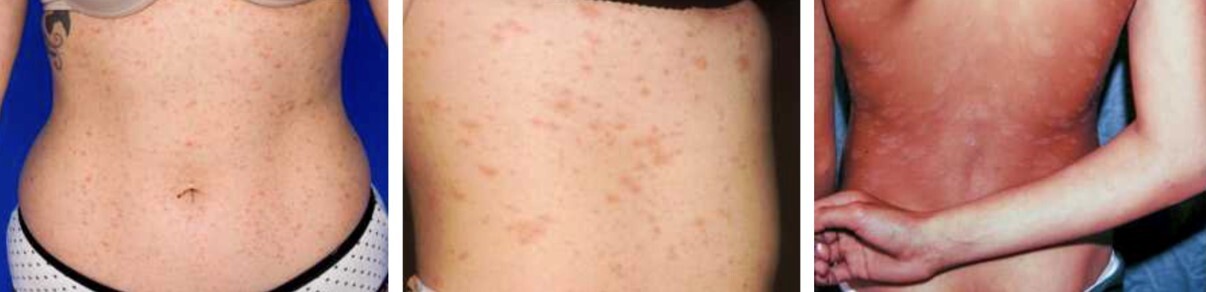 Followed by a general exanthem 1 to 2 weeks later: smaller, very pruritic round to oval erythematous papules or thin plaques with a collarette of scale in a Christmas tree pattern