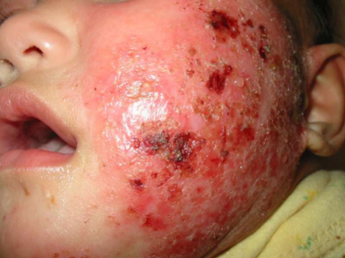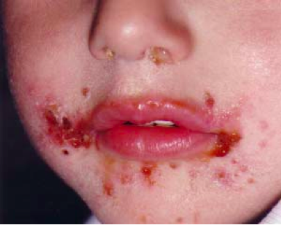 On examination his temperature is 37°C. He is irritable, and has extensive whole-body eczema with excoriation and crusting. The lesions around his mouth are shown above.