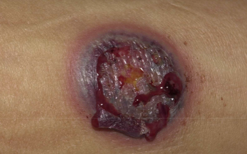 A five-year-old boy presents with multiple ulcerated skin lesions (as shown) with raised margins, which commenced as pustular lesions associated with fever a week prior to presentation. Pyoderma gangrenosum is confirmed by skin biopsy.