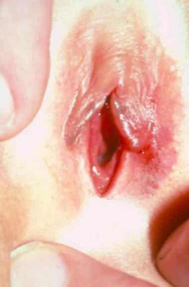 An eight-year-old girl is referred for assessment of her chronic perineal irritation. A photograph of her genitalia is shown below.