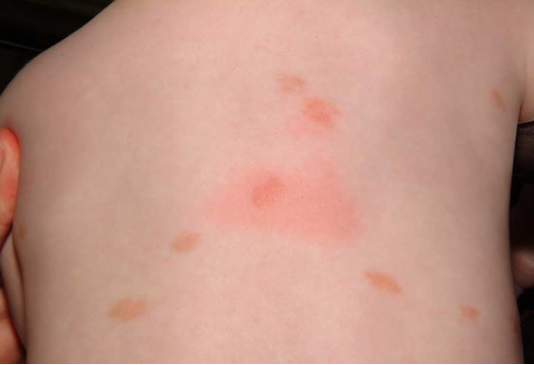 A nine-month-old boy is seen in clinic with an eight week history of an itchy rash. Reddish-brown macules and papules are noted on his trunk and back as shown in photo one. He takes prophylactic cotrimoxazole for high grade vesicoureteric reflux but is otherwise well.