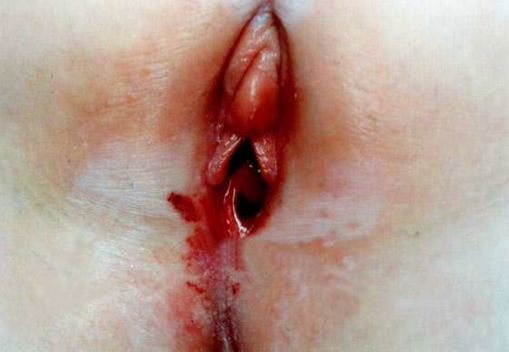 A two-year-old girl returns from child care after an apparently ordinary day. When her mother undresses her for her bath she notices blood in the girl’s underwear. The mother examines the girl’s genital region and notices the findings in the photograph.