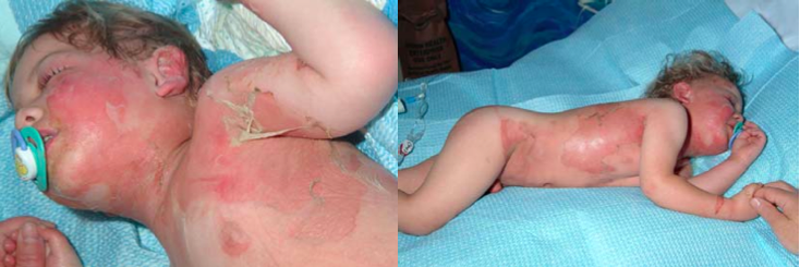 A previously well two-year-old boy presents to his general practitioner with tonsillitis and a macular red rash over his body. He is treated with oral Penicillin V. After two days he is admitted with a sudden onset of fever (38.5°C), irritability and painful skin. On examination he is miserable; screams when touched; has erythema of the face, axillae, neck, buttocks and groin; and peeling skin at the tip of his penis. Rubbing the skin leads to wrinkling and erosions of the epidermis. He has crusting around the mouth and nose and mild conjunctivitis. On day two of admission he develops large flaccid bullae on areas of red skin as shown in the photographs below.