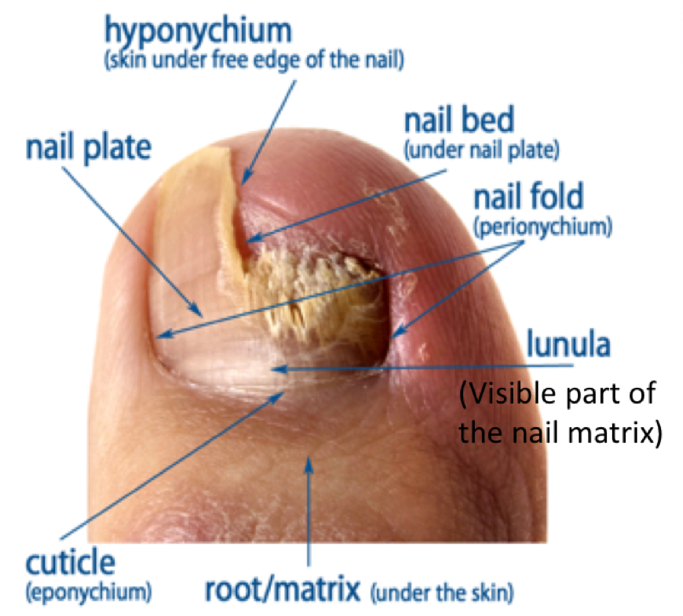 What is the anatomy of nails and what is a condition that is caused by the dysfunction of nails?