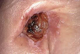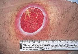 full-thickness tissue loss with damage to or necrosis of subcutaneous tissue - may extend to underlying fascia - appears as a deep crater with or without undermining of adjacent tissue and w/out exposed muscle or bone - drainage and infection are common