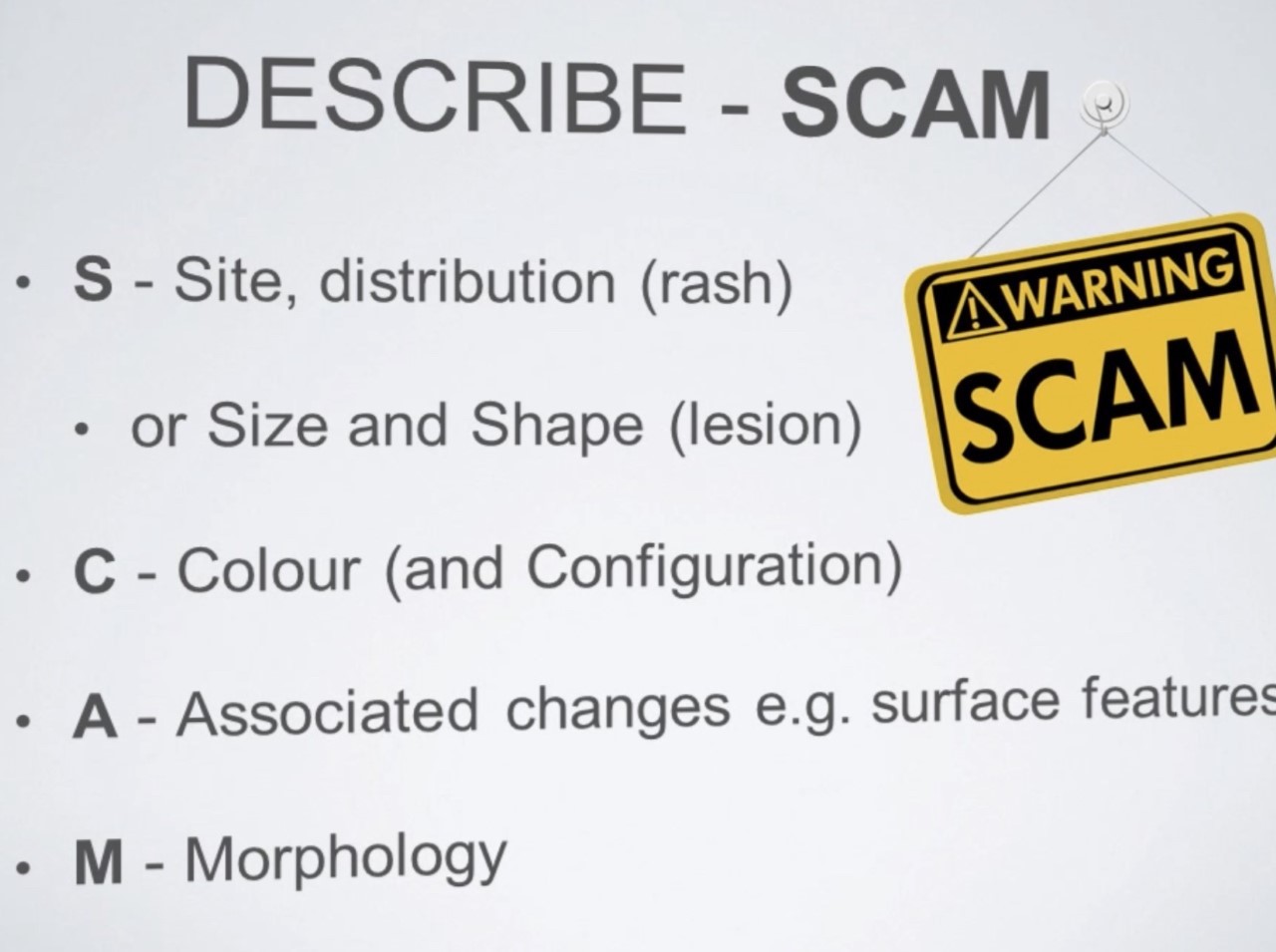 Remind yourself of the SCAM mneumonic to help you describe skin lesions