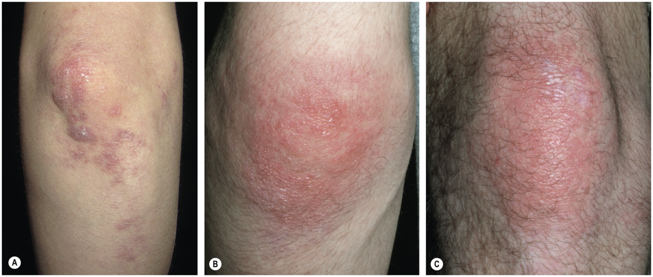 plaques squameuses atrophiques, érythémateuses, parfois prurigineuses
