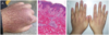 fissures, hyperkératose ou desquamation des doigts ou des paumes
