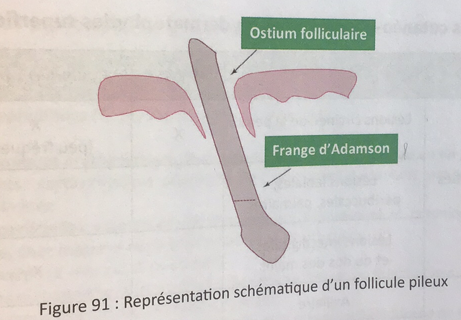 ➞ Dev. à partir de l’osmium folliculaire et progression descendante centripète : arrêt à la frange d’Adamson (vers le bulbe)