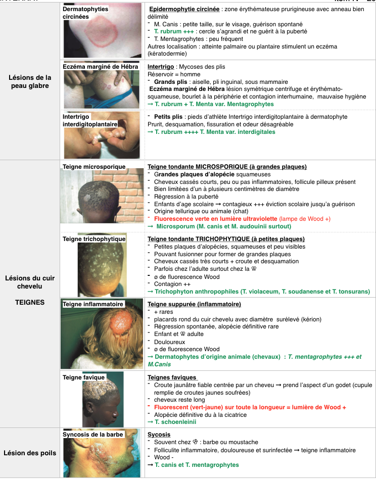 Dermatophytoses anthropophiles : parties COUVERTES du corps ø réaction inflammatoire