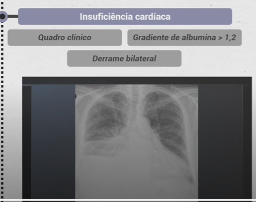 Insuficiência cardíaca, pneumonia, derrame parapneumônico, tuberculose e neoplasia.