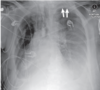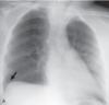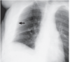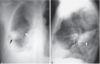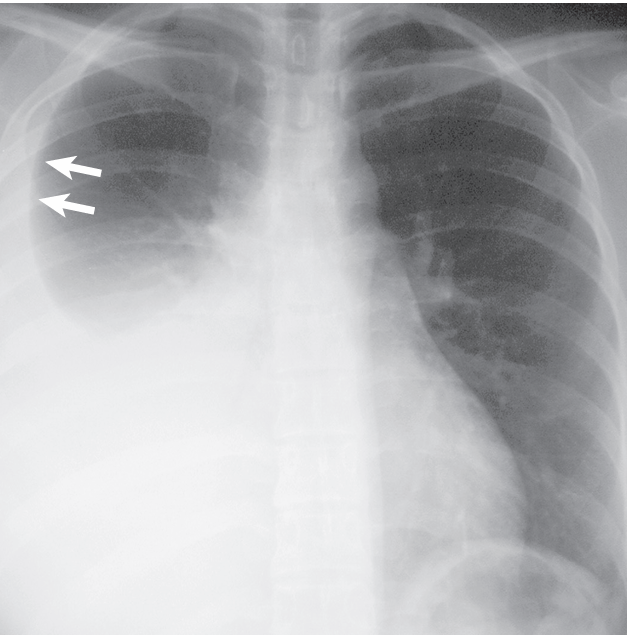 Fig. 72.1 Derrame pleural libre. La radiografía posteroanterior de tórax muestra el signo del menisco (flechas) en un gran derrame pleural derecho.