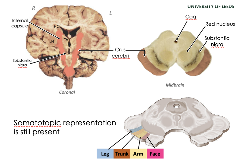 How is somatotopic organisation maintained as fibres pass from the internal capsule to the next structure?