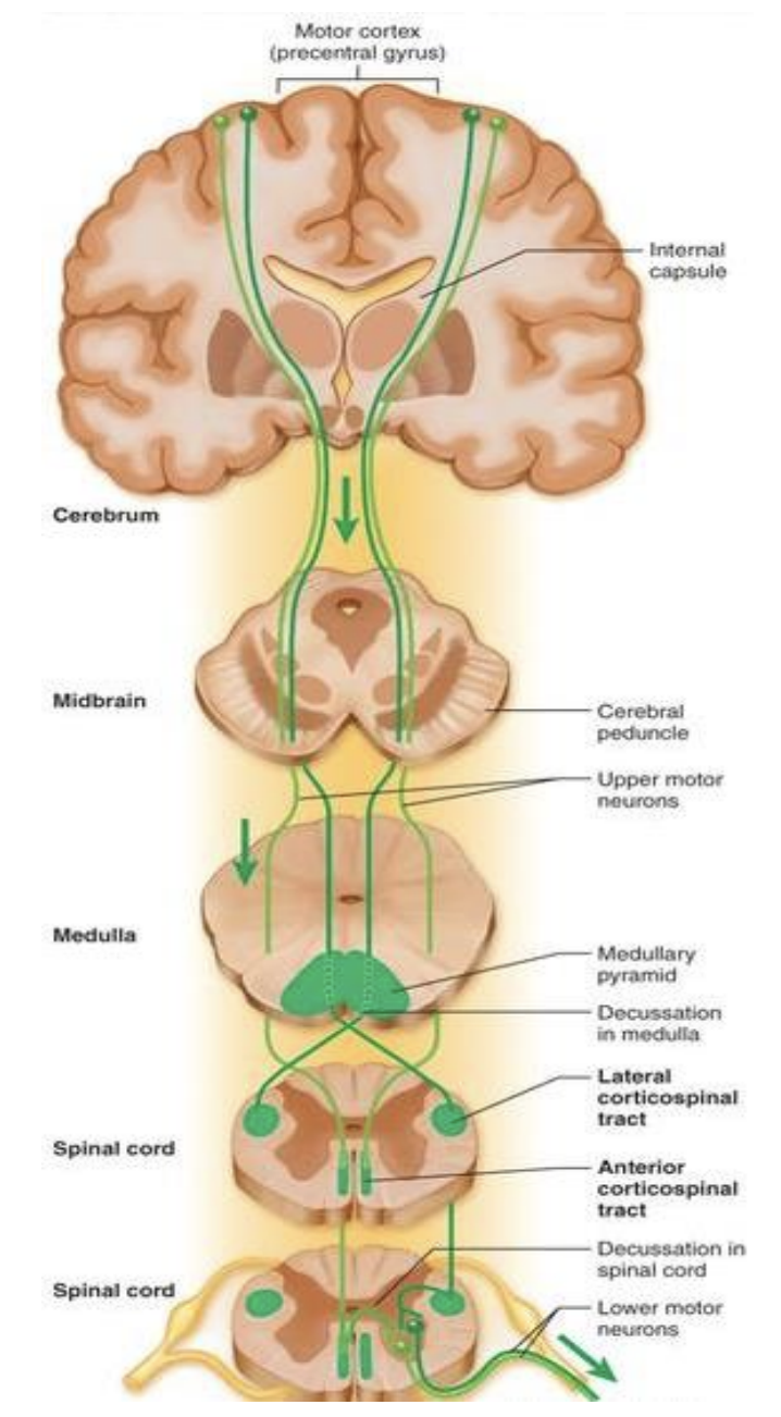 neurons in the motor cortex that give rise to axons that travel through the corona radiate and internal capsule