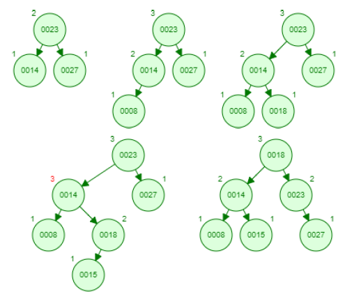 Agora vamos inserir o 15! Esse nó iria para a esquerda de 18 como mostra a primeira imagem abaixo. Nesse caso, o nó 23 ficaria desbalanceado.