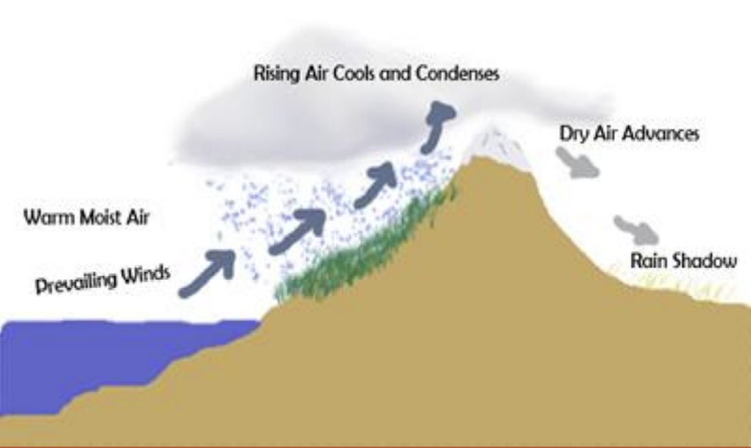 Mountains block moist winds, causing rain on one side and dryness on the other