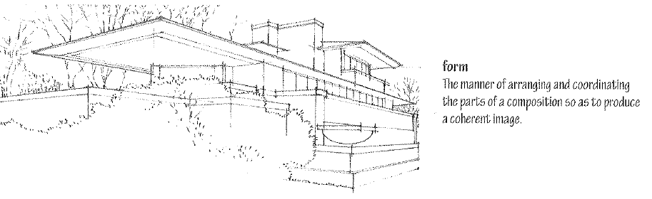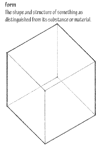 The outline or surface configuration of a particular form or figure. While form usually refers to the principle that gives unity to a whole and often includes a sense of mass or volume, shape suggests an outline with some emphasis on the enclosed area or mass.