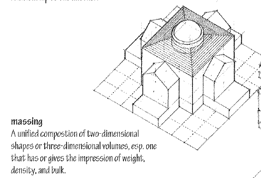 A unified composition of two-dimensional shapes or three-dimensional volumes, esp one that has or gives the impression of weight, density, and bulk.