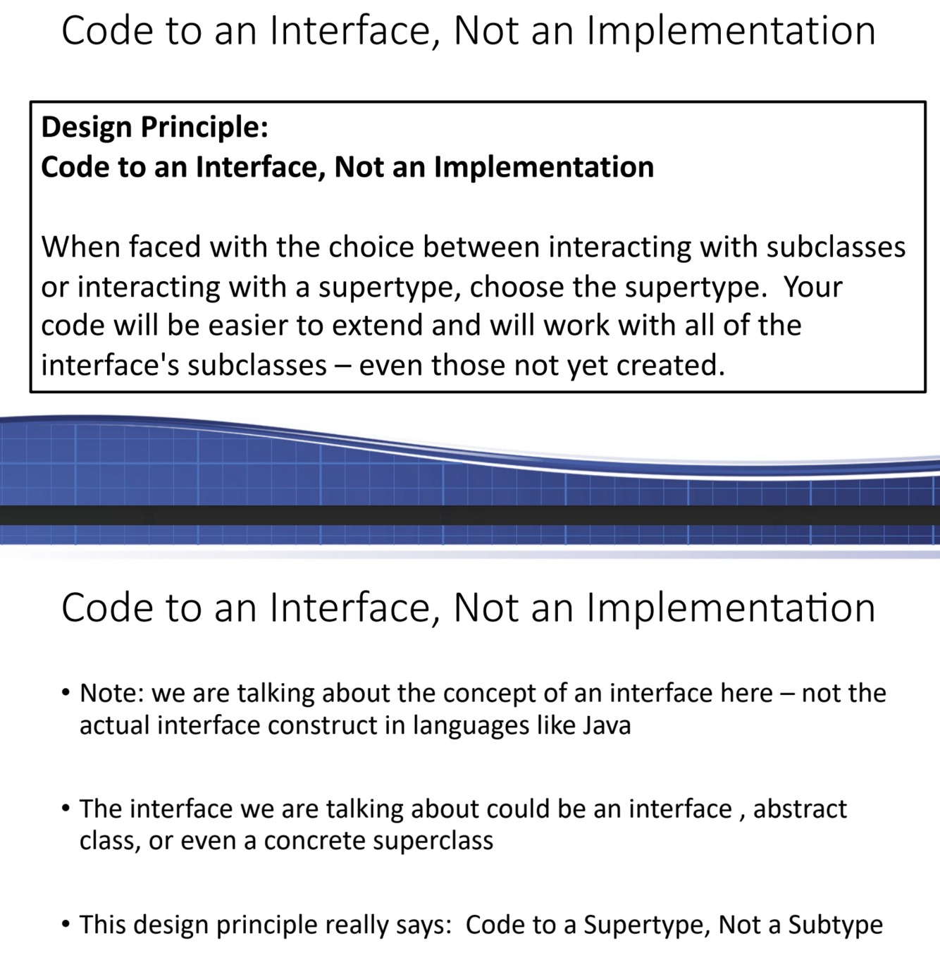 What does it mean to “Code to and Interface, Not an Implementation”?