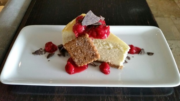 Vanilla cheesecake with graham cracker, cherry compote and chocolate