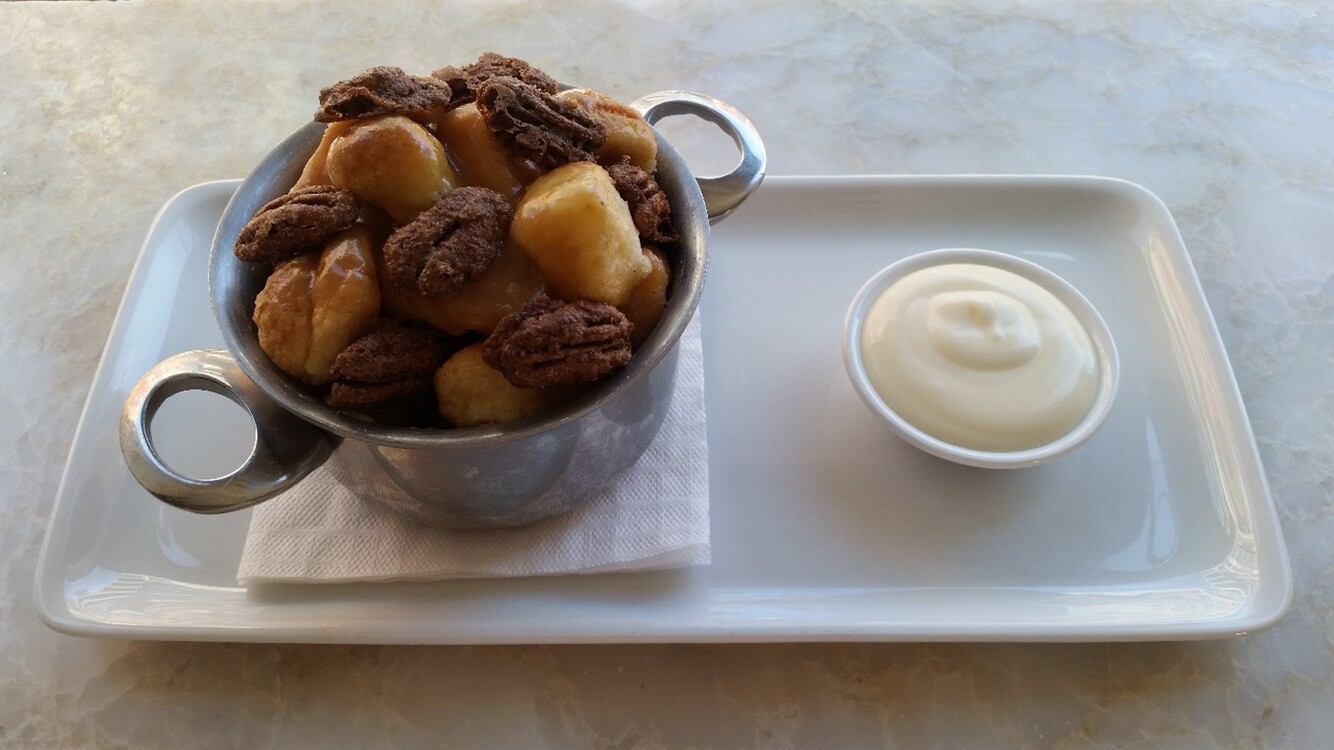 : Balls of dough are tossed with melted butter then cinnamon sugar. They are placed in a mold with gooey cinnamon caramel and left to rise until soft and pillowy. The monkey bread is then baked until golden and served with cream cheese dip and spiced pecans.