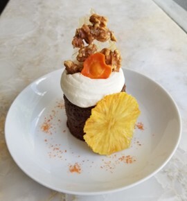 It is flavored with cardamom, cinnamon and nutmeg. It is baked in a ring mold. Once cooled it’s topped with cream cheese frosting. It is garnished with candied walnuts, a dried pineapple slice and a candied carrot. The plate is dusted with dried carrot dust.