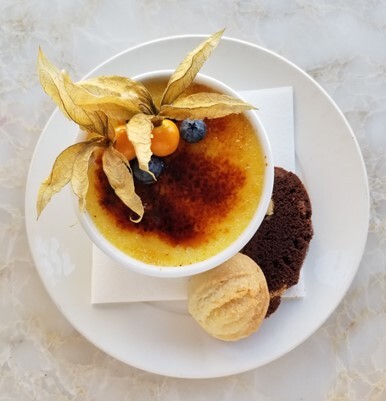 This is a classic vanilla bean crème brulee. The custard base is made with cream, sugar, egg yolk and vanilla beans. It is poured into bowls and baked in a water bath until it is set. It is then cooled. Once chilled it is topped with granulated sugar and torched until caramelized, topped with berries and served with orange shortbread and chocolate biscotti. The caramelized sugar top cracks open when hit with a spoon to reveal the smooth custard underneath.